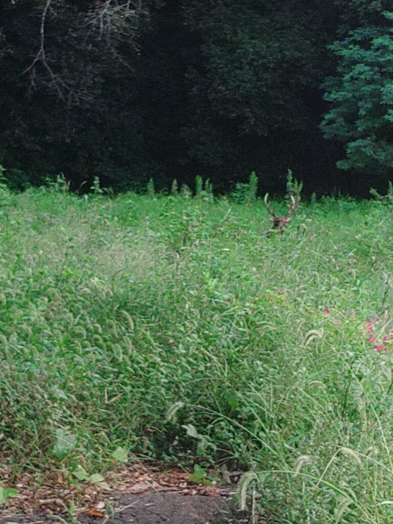 ふと、雑草の中を見ましたら、角が見えました。え?オスシカ・・でしょうか?そのまま観察しますと、やはり立派な角のオスシカです。この場所で寝て居たのでしょうか?暫く動く気配は有りません。こちらの気配をかき消す様に、軽トラのエンジンを切って、スマホで撮影しようと何枚か撮りました。「じょん」は、相変わらずキツネの相手して居ます。